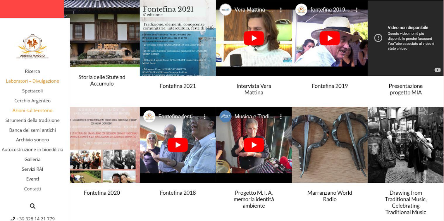 Alberi di Maggio utilises a website to disseminate Intangible Cultural Heritage (ICH), featuring videos and recordings of oral performances and festivals, linked to a YouTube channel and a Facebook page. The primary aim of this research into local oral traditions is to collect video and audio testimonials that safeguard and promote this heritage, raising awareness among young local people.